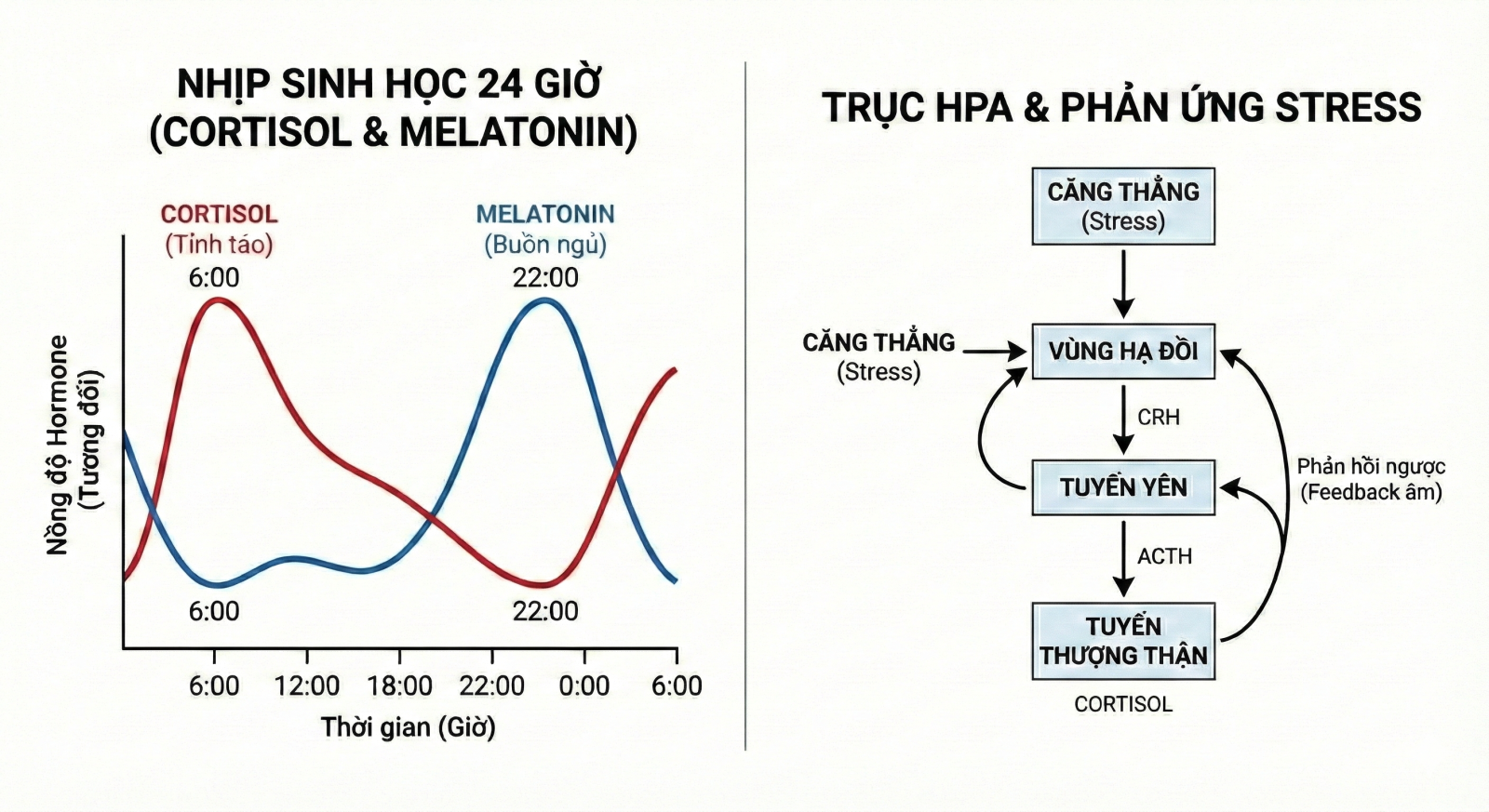 Nhịp sinh học 24 giờ của cortisol và melatonin, cùng cơ chế phản ứng stress qua trục HPA
